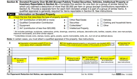 3.What tax forms are required for taking the deduction? If the donation of materials is in excess of $5,000 then the IRS requires an IRS defined Qualified Appraisal by an IRS defined Qualified Appraiser. The taxpayer must remit IRS Form 8283, which must be filled out by the client in its entirety and signed by both the nonprofit and the appraiser. Please note case Loube v. Commissioner, the deduction was disallowed when the taxpayer did not properly full out the form and the appraiser forgot to sign.Here are the portions of the form the taxpayer must ensure are filled out correctly: