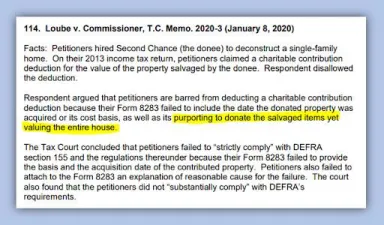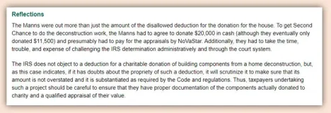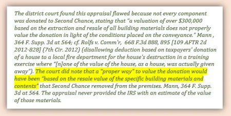 The same appraiser and nonprofit involved in Mann were involved in this case in which the tax deduction was disallowed. In this write up by IRS Counsel Theresa Melchoire, the taxpayer, nonprofit and appraiser made the disallowance easy due to not filling out Form 8283 in its entirety. Ms. Melchoire provided the following memorandum entry. The valuation methodology, again, used R.S. Means to determine the value of the whole house without respect to what was actually donated and did not base the value on market data. Essentially, the house was valued in the pre-deconstructed state.